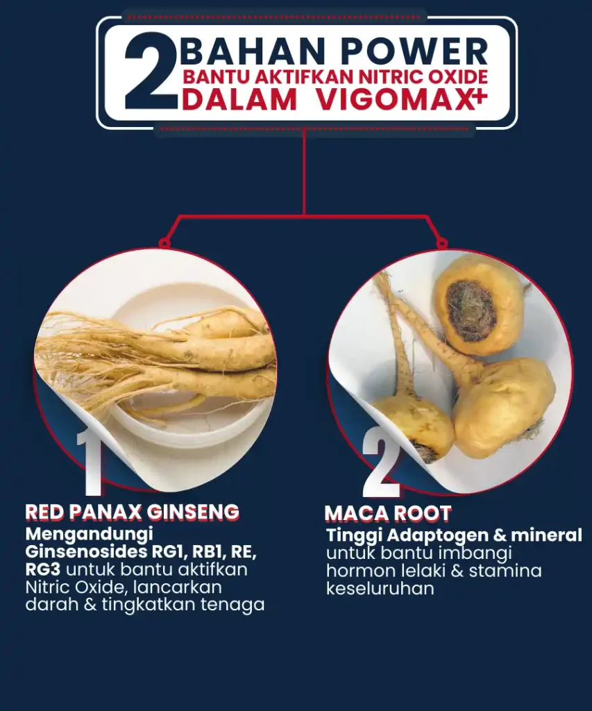 Vigomax+ guna bahan aktif Ginsenosides dari Red Panax Ginseng ,yang bantu tubuh hasilkan semula Nitric Oxide dalam masa 10 minit.