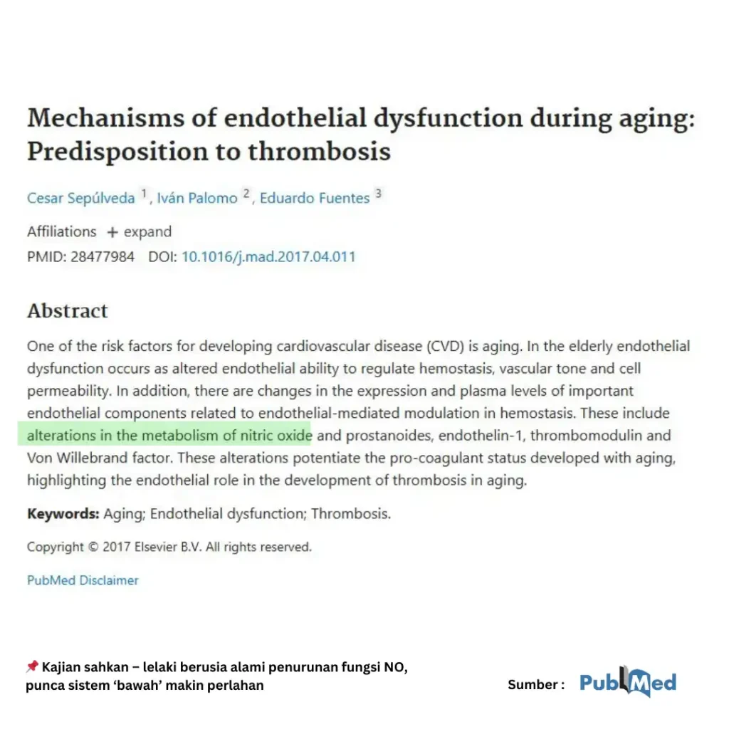 Kajian Elsevier (2017) dapati, bila fungsi endothelial menurun, penghasilan Nitric Oxide (NO) juga turun dan aliran darah ke zakar makin perlahan.